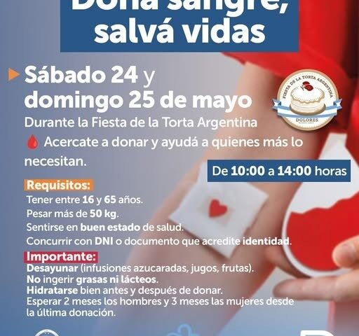 La Secretaría de Salud de la Municipalidad de Dolores intensifica la Campaña de Donación de Sangre. En esta oportunidad, los días 24 y 25 de mayo, en Plaza Castelli, durante la Fiesta…
