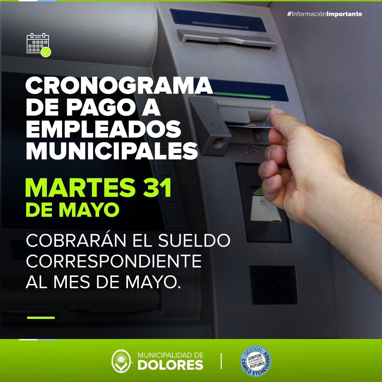El martes 31 de mayo, último día hábil del mes cobrarán los empleados municipales. Así lo informó el Intendente Camilo Etchevarren.
