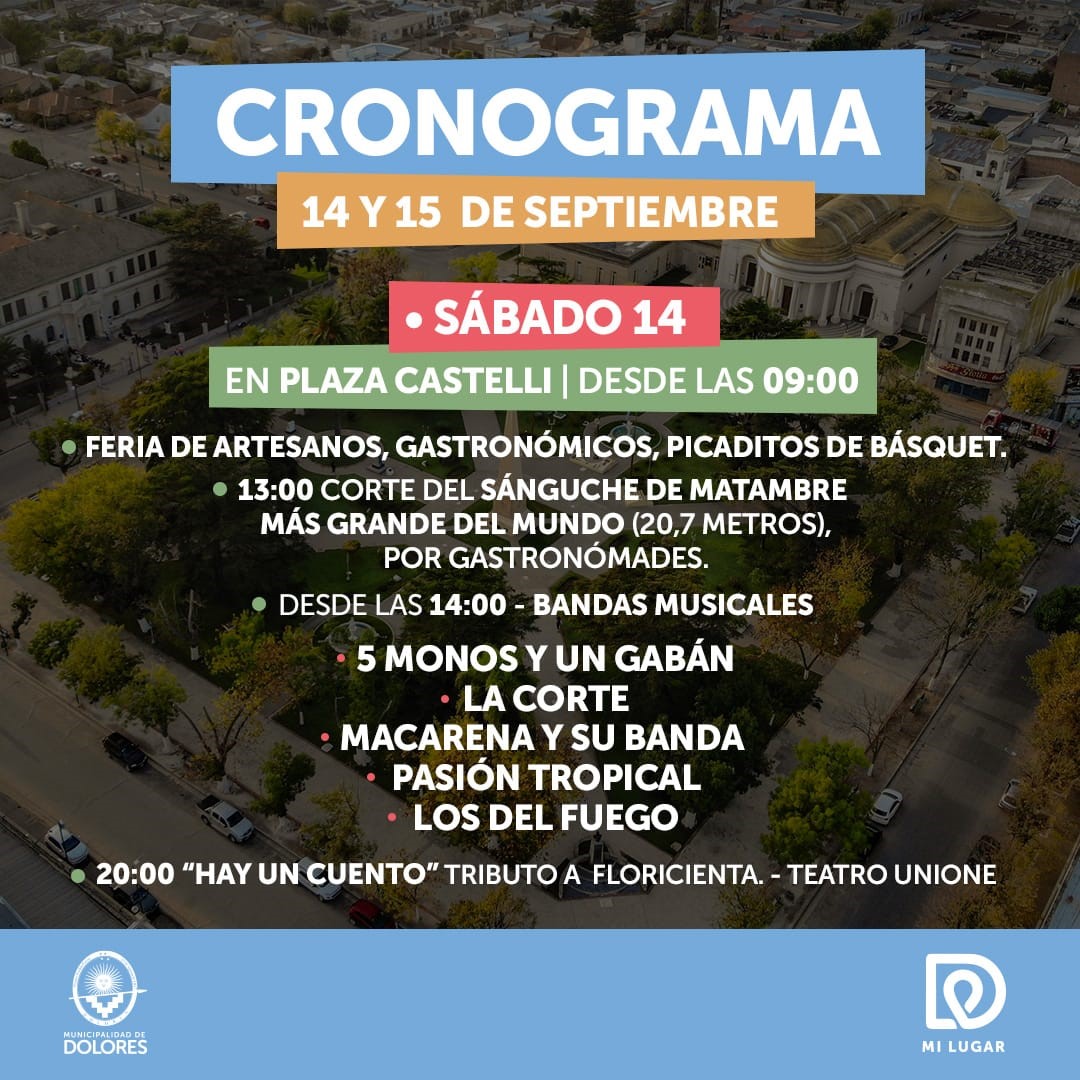 El sábado 14 a partir de las 9.00 horas, en la plaza Castelli, se presentará la feria de emprendedores y propuestas gastronómicas y picaditos de básquet. A las 13.00 horas se realizará el corte del sanguche más grande del mundo (20,7 metros) realizado por Gastronómades, en honor a los 207 años de la ciudad.