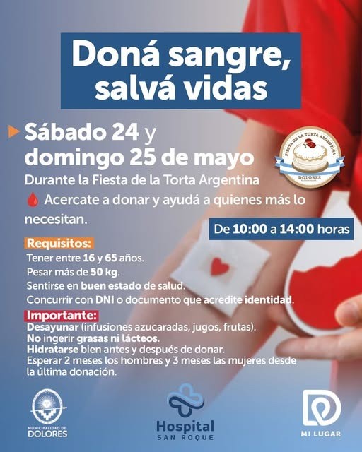 En esta oportunidad, los días 24 y 25 de mayo, en Plaza Castelli, durante la Fiesta de la Torta Argentina se podrá donar sangre en el horario de 10:00 a 14:00 hs.