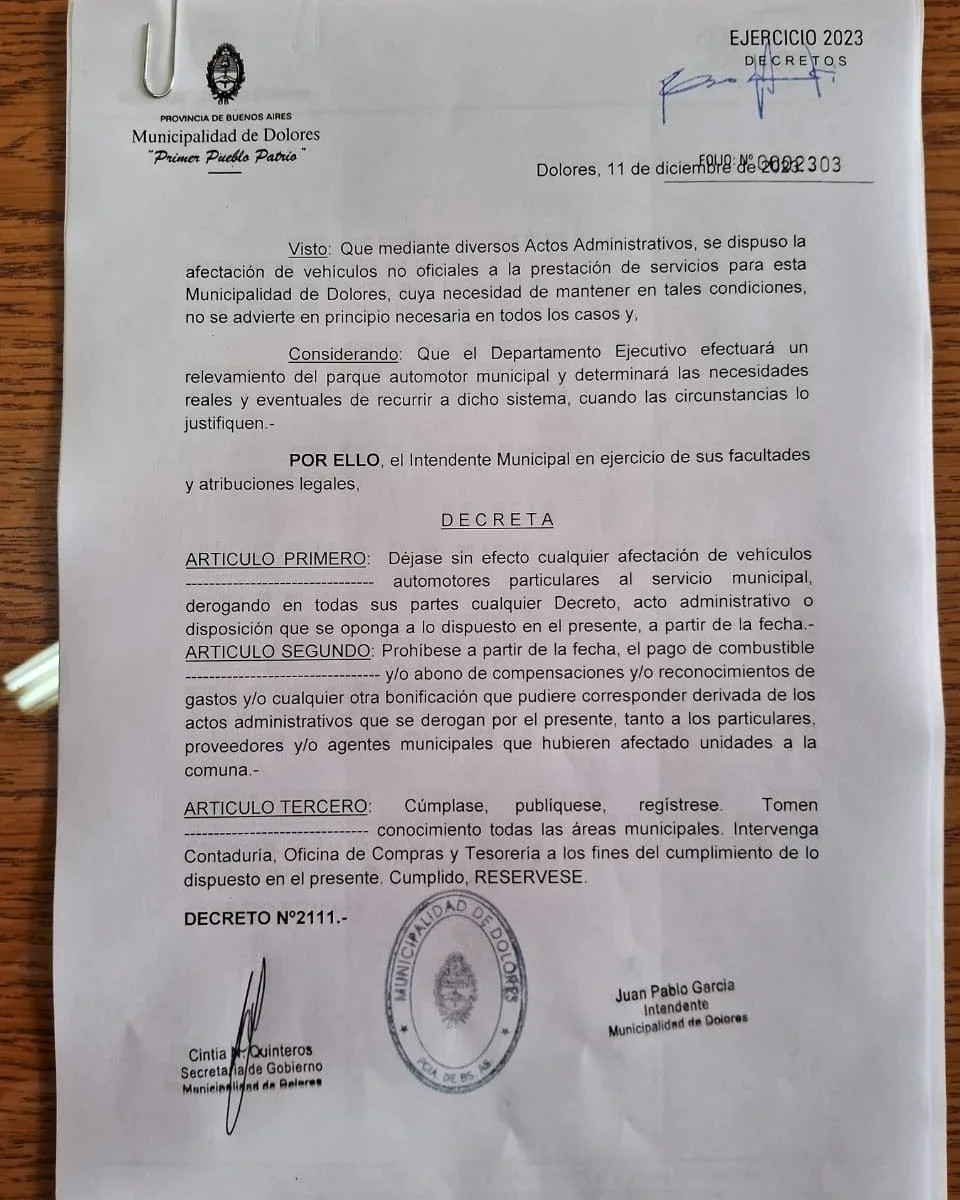 Tal como se anunció ayer, este decreto confirma la no afectación de vehículos no oficiales a la prestación de servicios para la Municipalidad de Dolores.