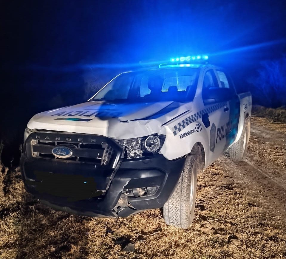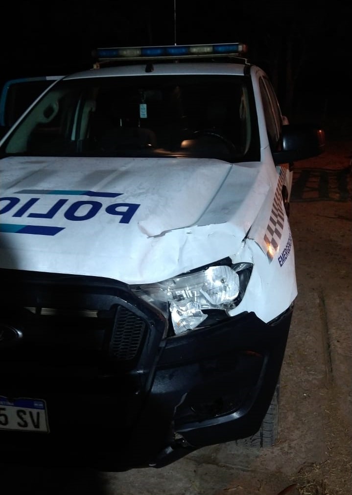 En tal circunstancia al dirigirse por dicho terraplén, se le cruzó un animal equino que subió imprevistamente al camino y se produjo colisión con dicho animal, provocando daños en la parte frontal del rodado, el Personal policial resultó ileso. Se labran las actuaciones de rigor por colisión interviniendo la dirección de Control Disciplinario La Plata.