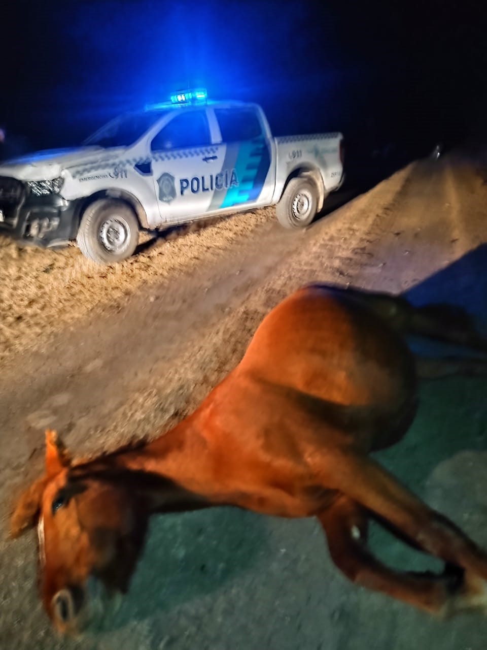 En tal circunstancia al dirigirse por dicho terraplén, se le cruzó un animal equino que subió imprevistamente al camino y se produjo colisión con dicho animal, provocando daños en la parte frontal del rodado, el Personal policial resultó ileso. Se labran las actuaciones de rigor por colisión interviniendo la dirección de Control Disciplinario La Plata.