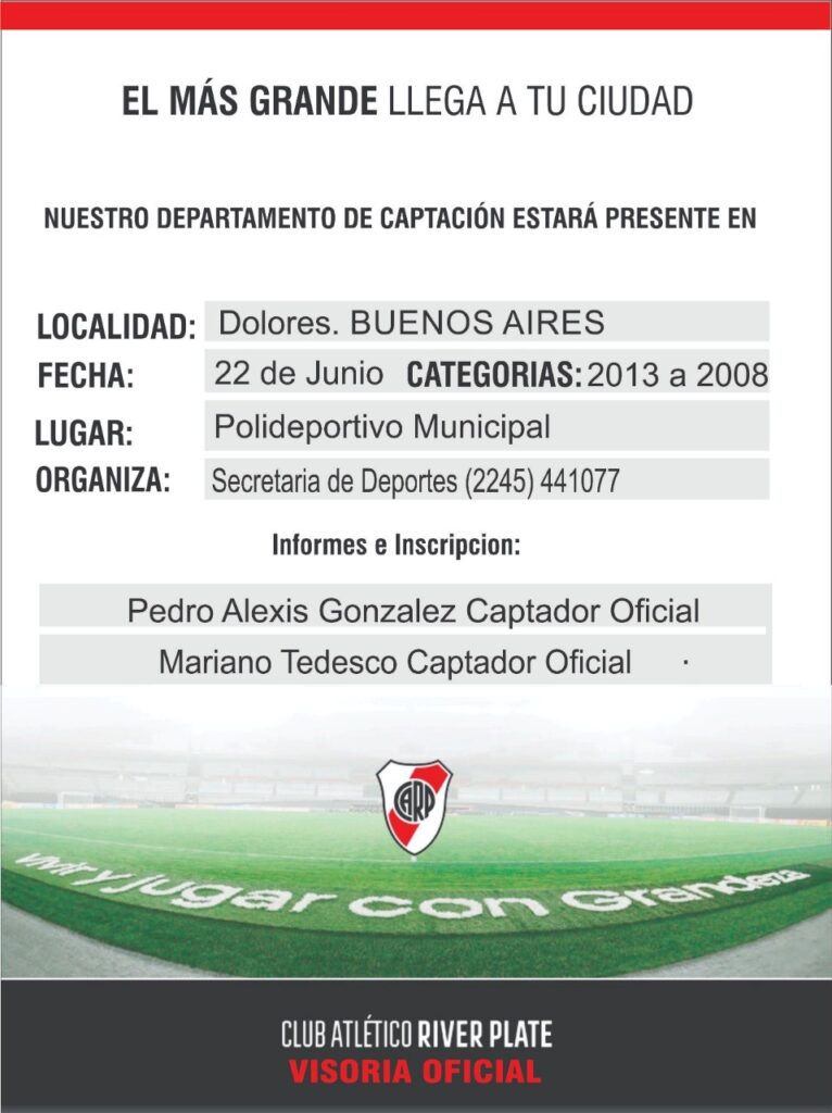 Desde la Secretaria de Deportes de la Municipalidad de Dolores se informa que el Departamento de Capacitación del Club River Plate, llegará a Dolores el miércoles 22 de junio a las 14.00, para tomar una prueba a jugadores de las categorías 2008 al 2013, en el Polideportivo, la que estará a cargo de Pedro Alexis González y Mariano Tedesco.
