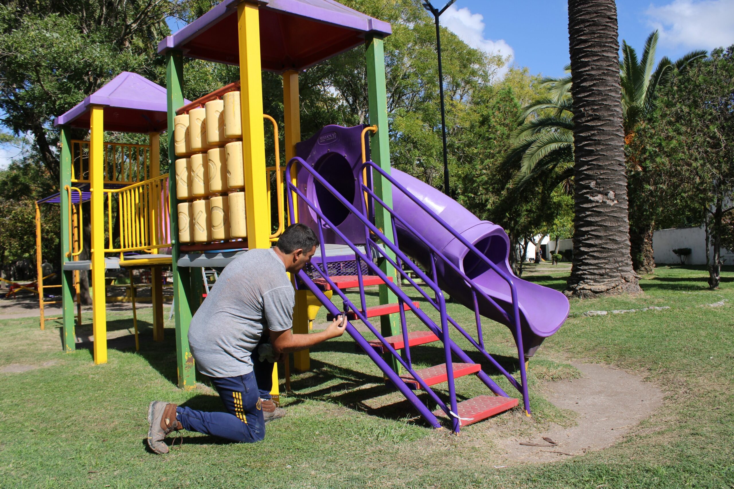 En la Plaza Negri, se llevó a cabo el mantenimiento del sector de juegos y senderos, tareas de pintura en juegos, bancos, columnas de iluminación y paredón medianera.
